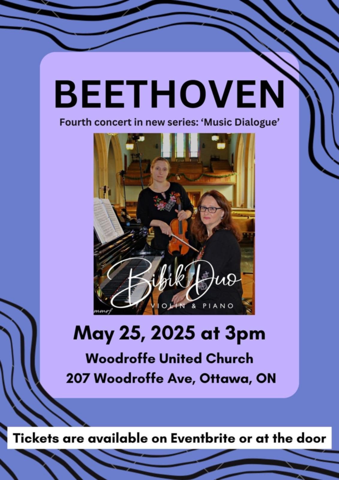 The Bibik Duo presents the forth concert of the season in their new music series Music Dialogues, featuring music by Beethoven, Schumann and Tchaikovsky. Anna Baksheeva, violin and Natalia Bibik-Chabukiani, piano are local professional musicians and music teachers who are passionate about chamber music for violin and piano and want to build community around their performances in the capital region